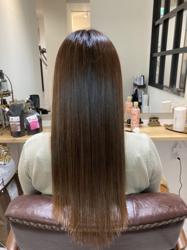 毛先の矯正の履歴のある部分も、必要に応じて内部を強化し艶を出す酸熱トリートメントやシステムコーストリートメントで集中的にダメージケアし、髪質改善していきます。