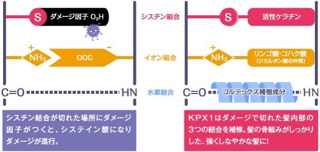 ダメージを受けて切れてしまった髪内部の結合を繋げていきます。※活性ケラチン、ジカルボン酸、コルテックス補強成分