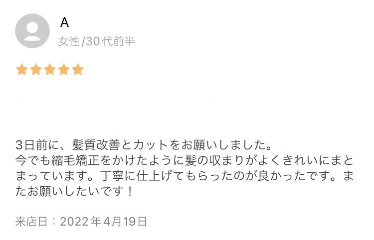 東京都町田市にある髪質改善&弱酸性縮毛矯正が得意なサロンglossが担当させて頂いているお客様から嬉しい感想をいただいております。